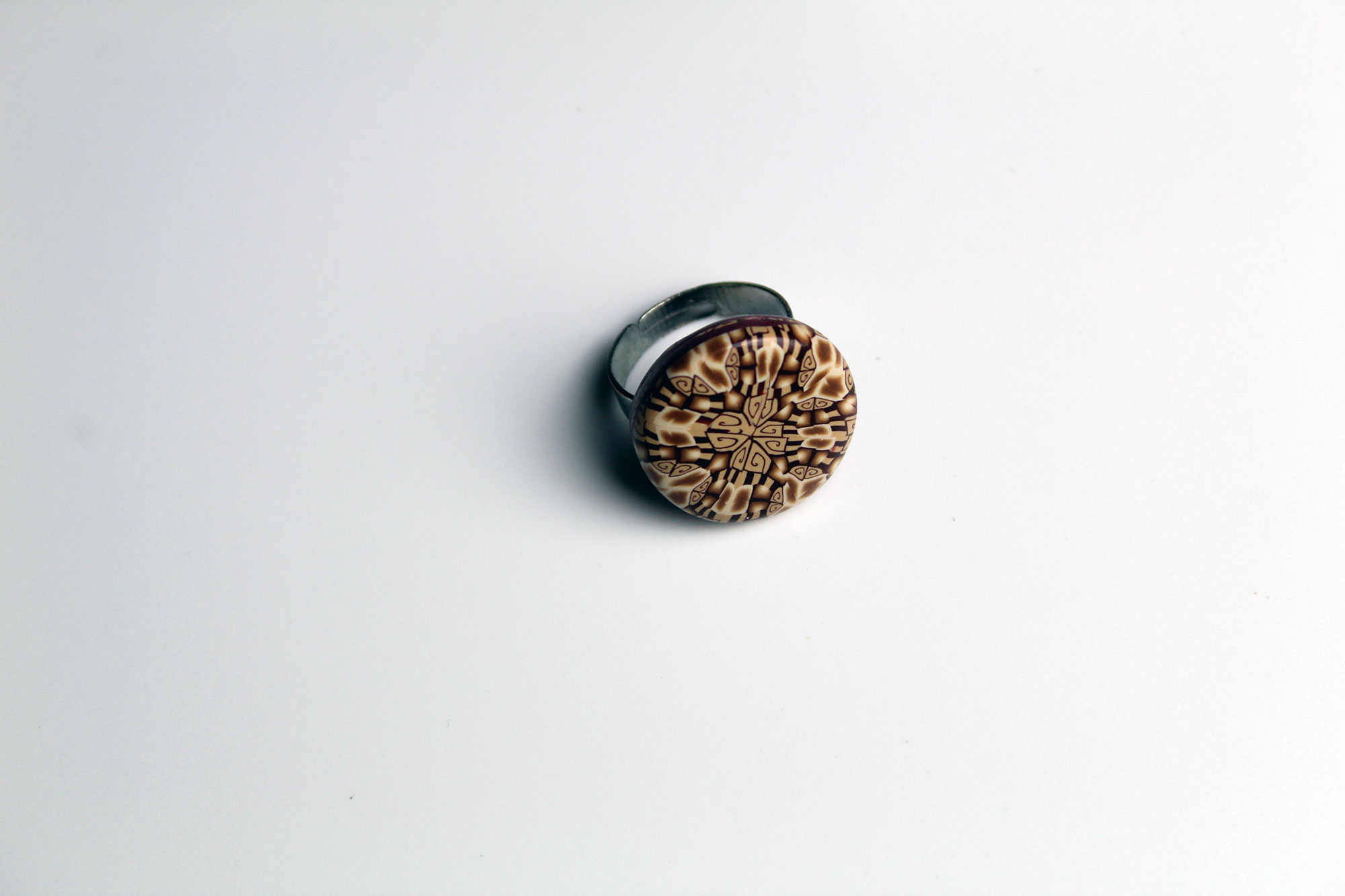 Anillo de 2 cm de diámetro, elaborado con la técnica de la murrina caleidoscópica, que confiere ese aspecto de filigrana a la pieza.