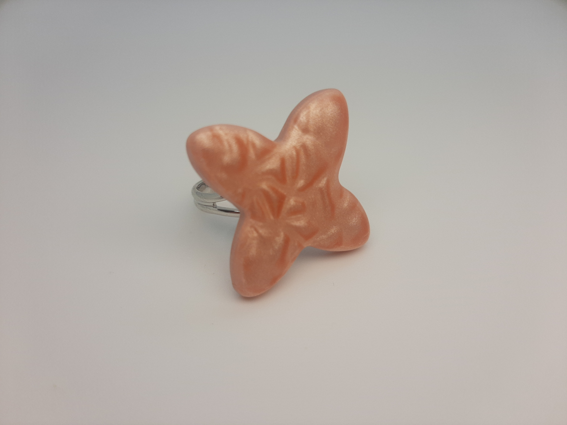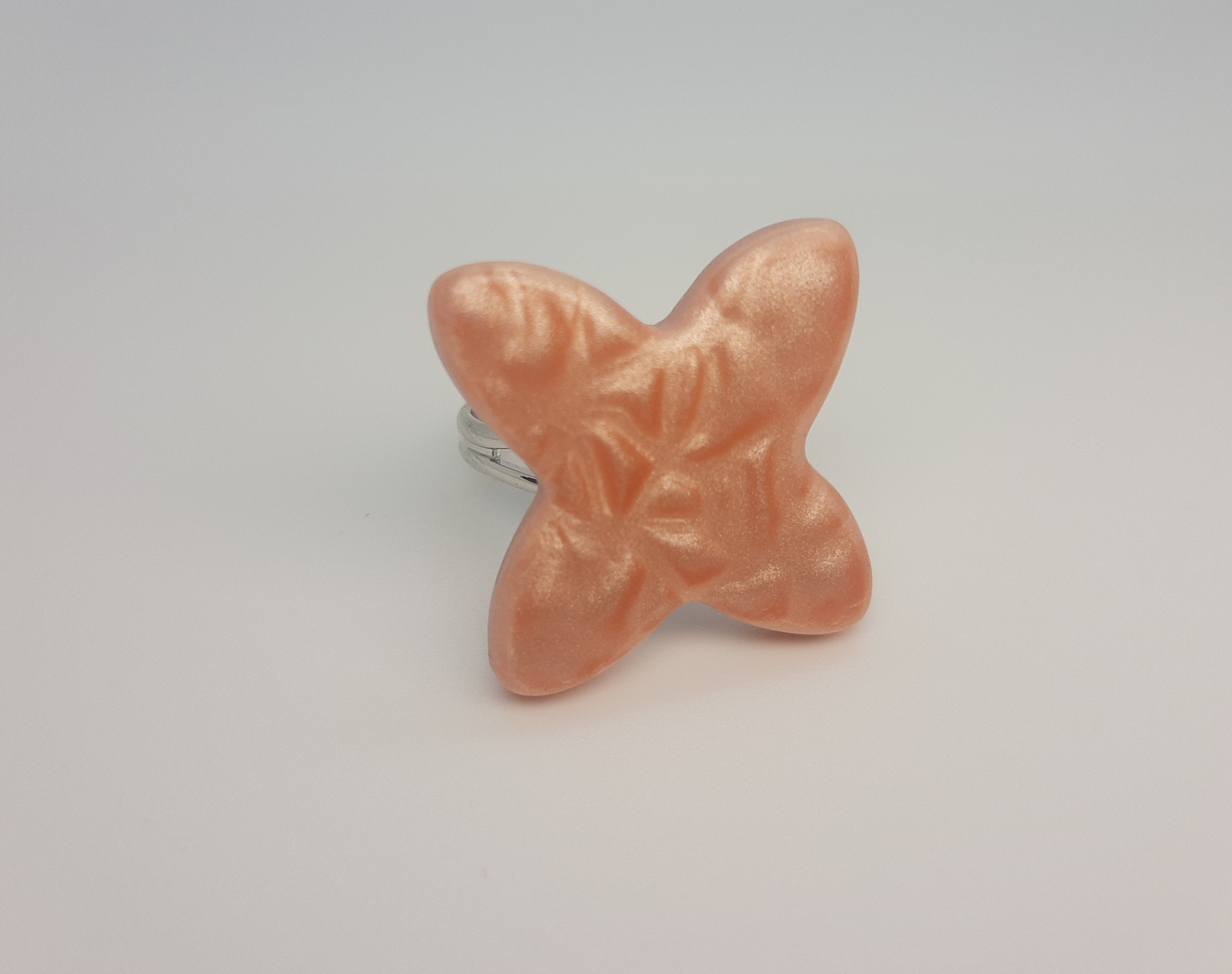 Anillo de 2,2 cm de lado en forma de flor, elaborado con la técnica mica shift y arcilla metalizada, que hace que adquiera ese falso relieve y textura..