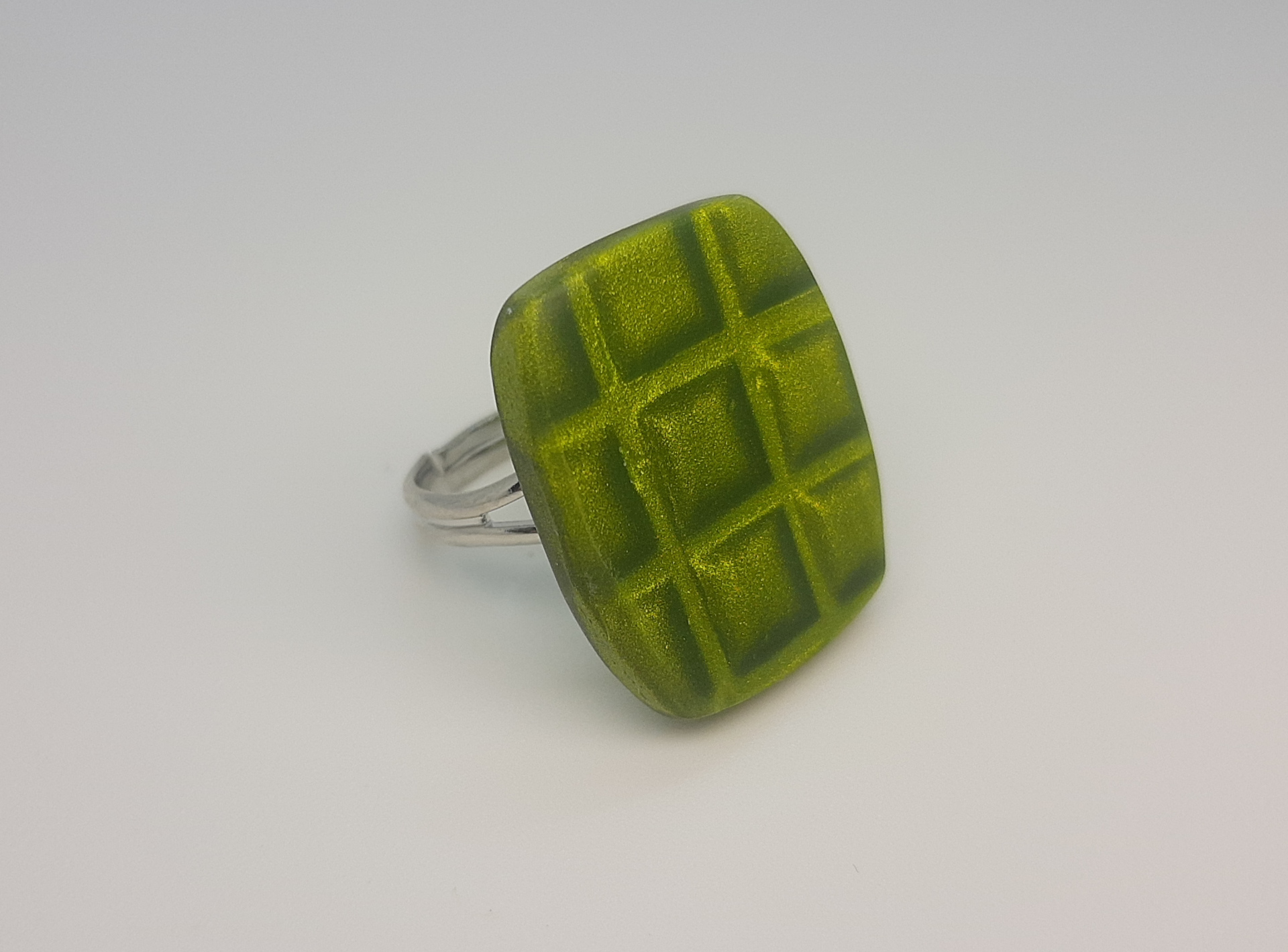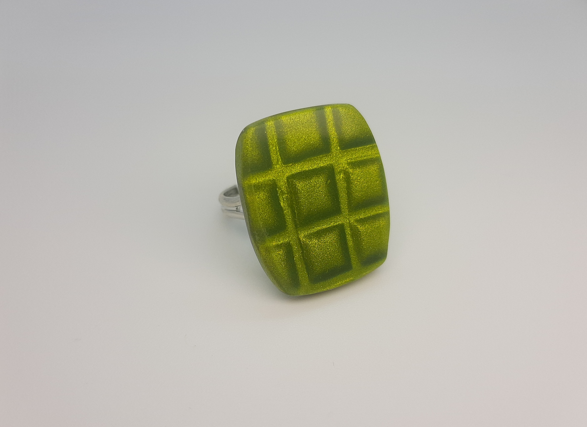Anillo de 2 x 2,3 cm de lado, elaborado con la técnica mica shift y arcilla metalizada, que hace que adquiera ese falso relieve y textura..