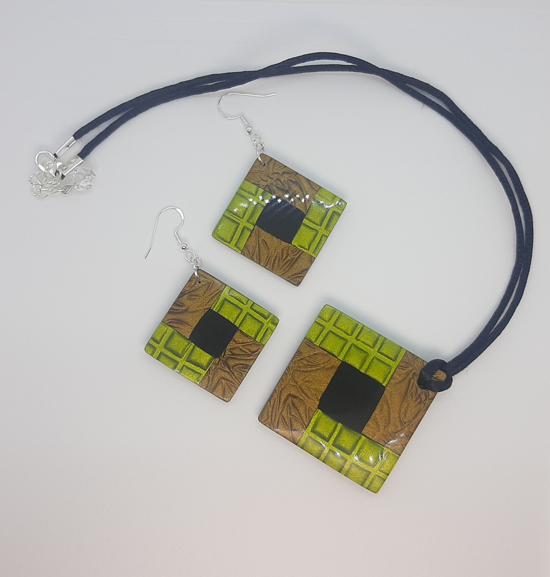 Colgante de 4 x 4 cm, elaborado con la técnica mica shift que genera ese efecto de falso relieve en la pieza.