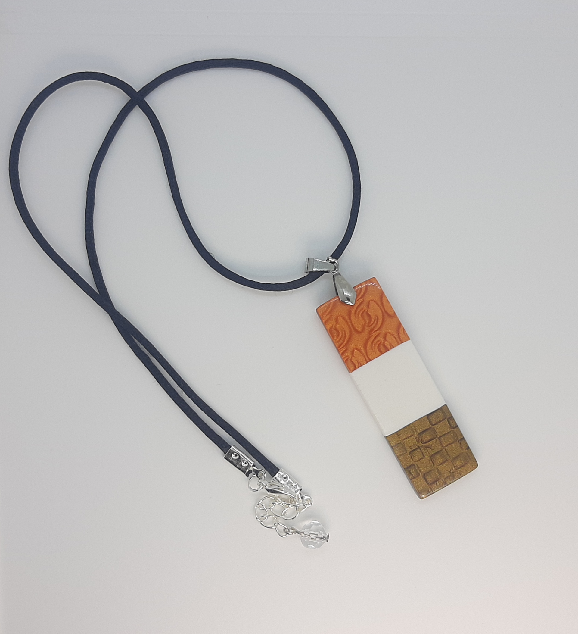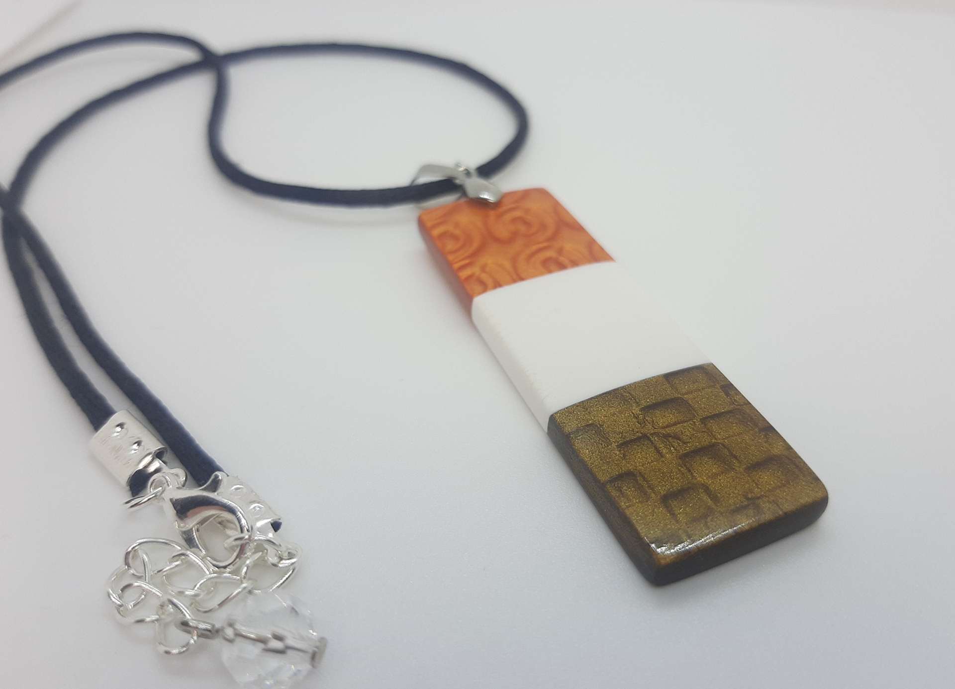 Colgante de 2 x 6 cm, elaborado con la técnica mica shift que genera ese efecto de falso relieve en la pieza.