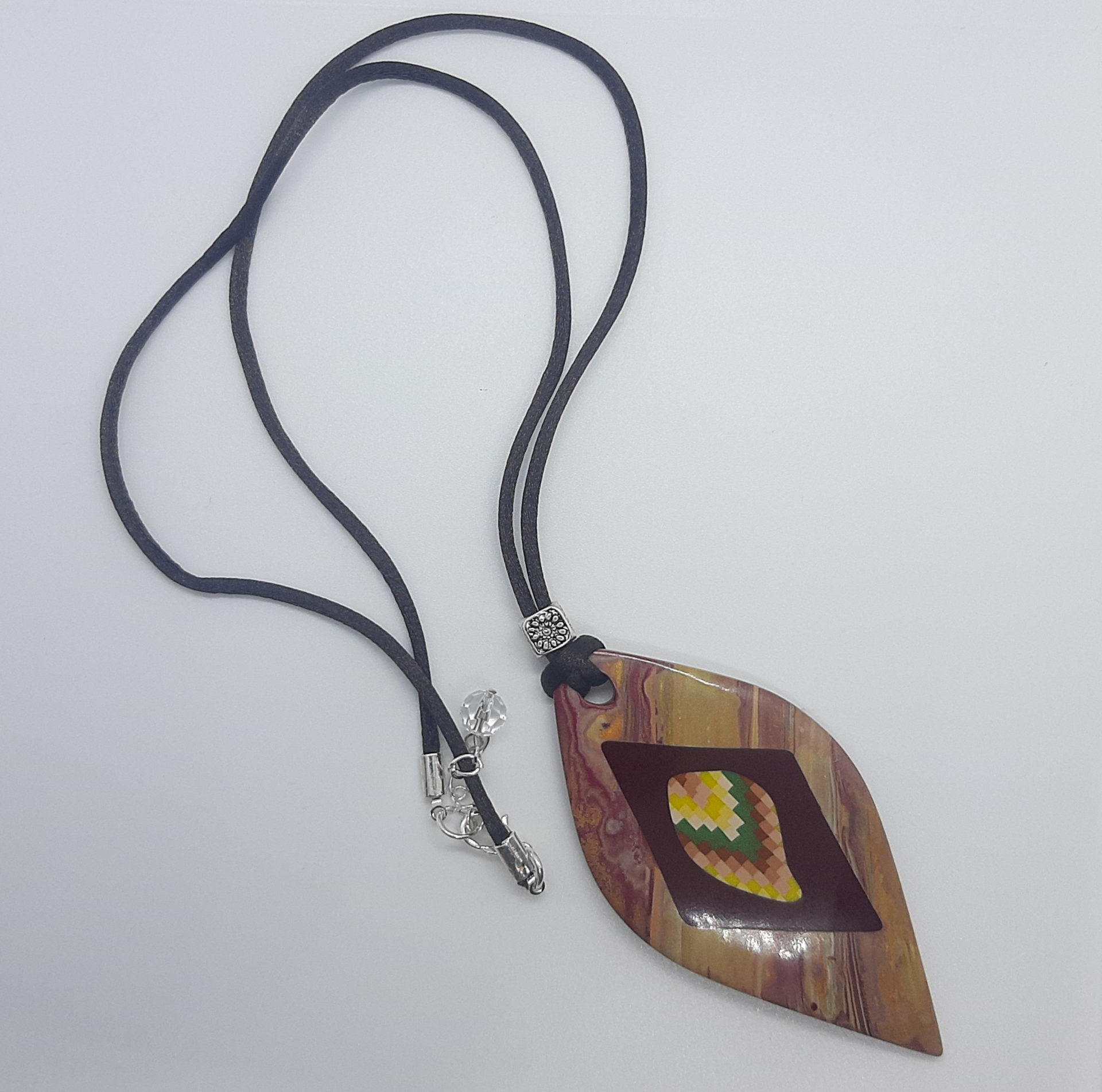 Colgante de 8 x 4 cm de ancho, elaborado con el uso de distintas técnicas en cada una de las piezas que se unen entre sí en un mismo plano.