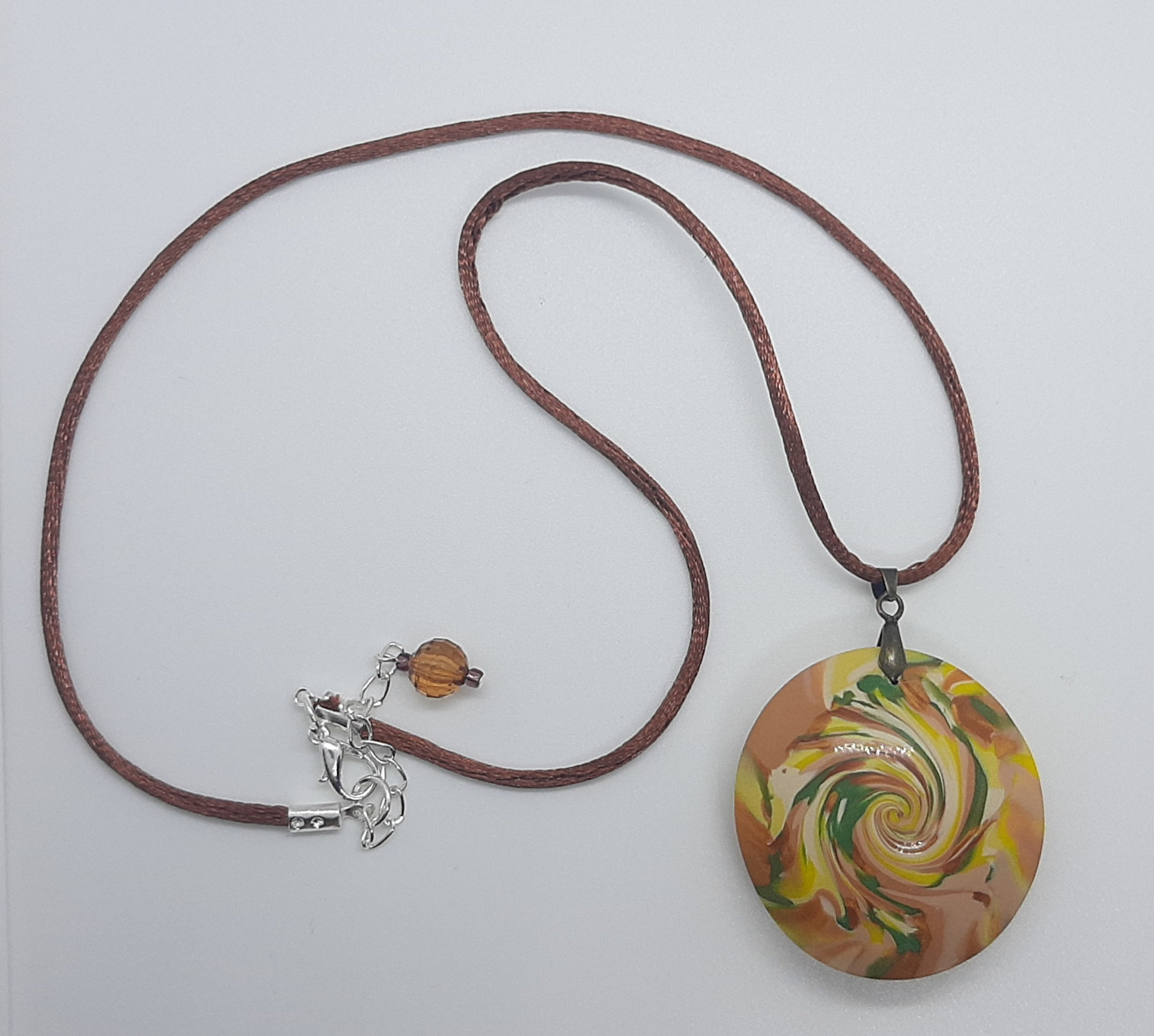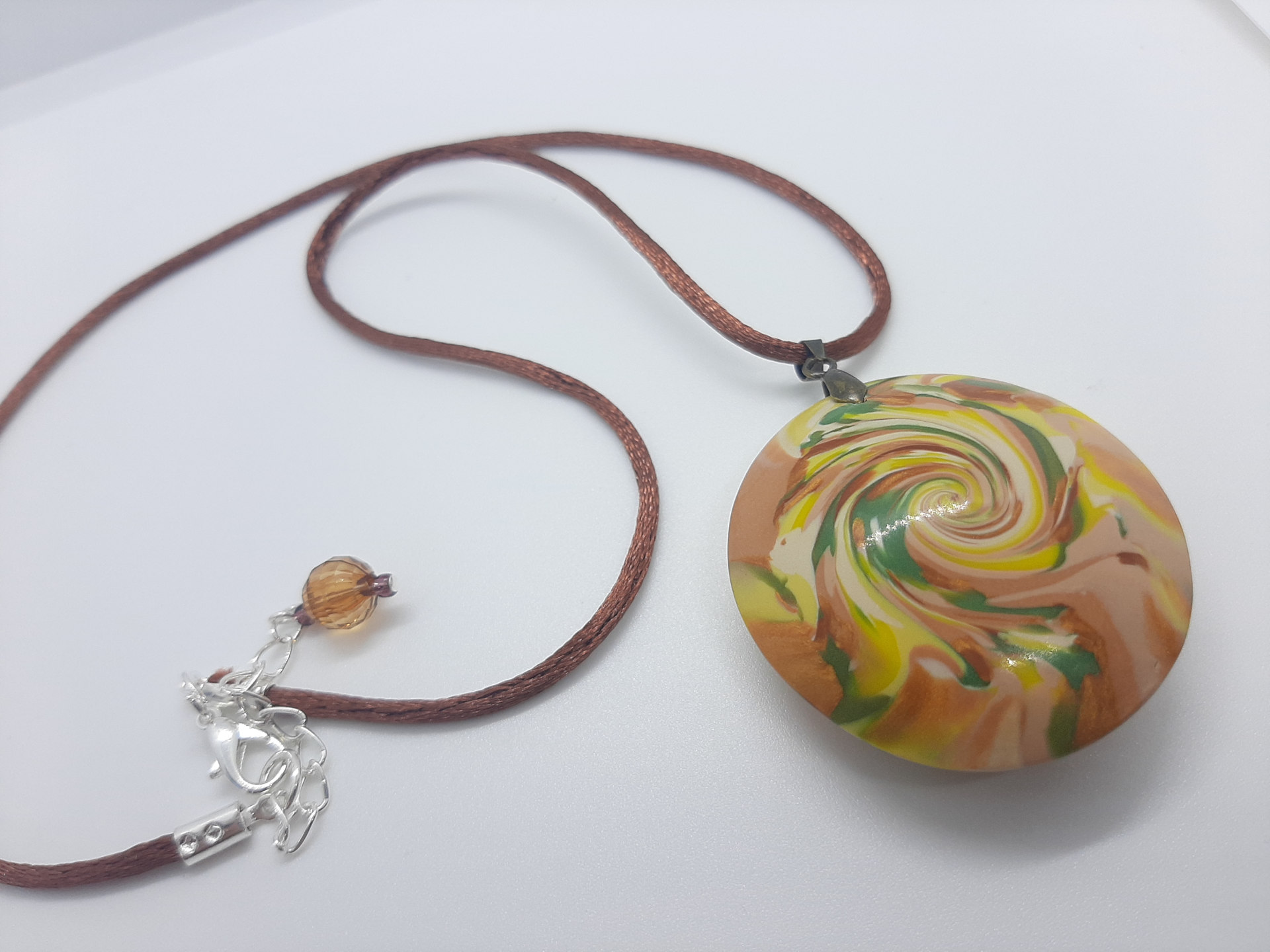 Colgante de 4 cm de diámetro, elaborado con la técnica de cuentas rotadas, que genera las espirales de vértigo en este tipo de piezas.