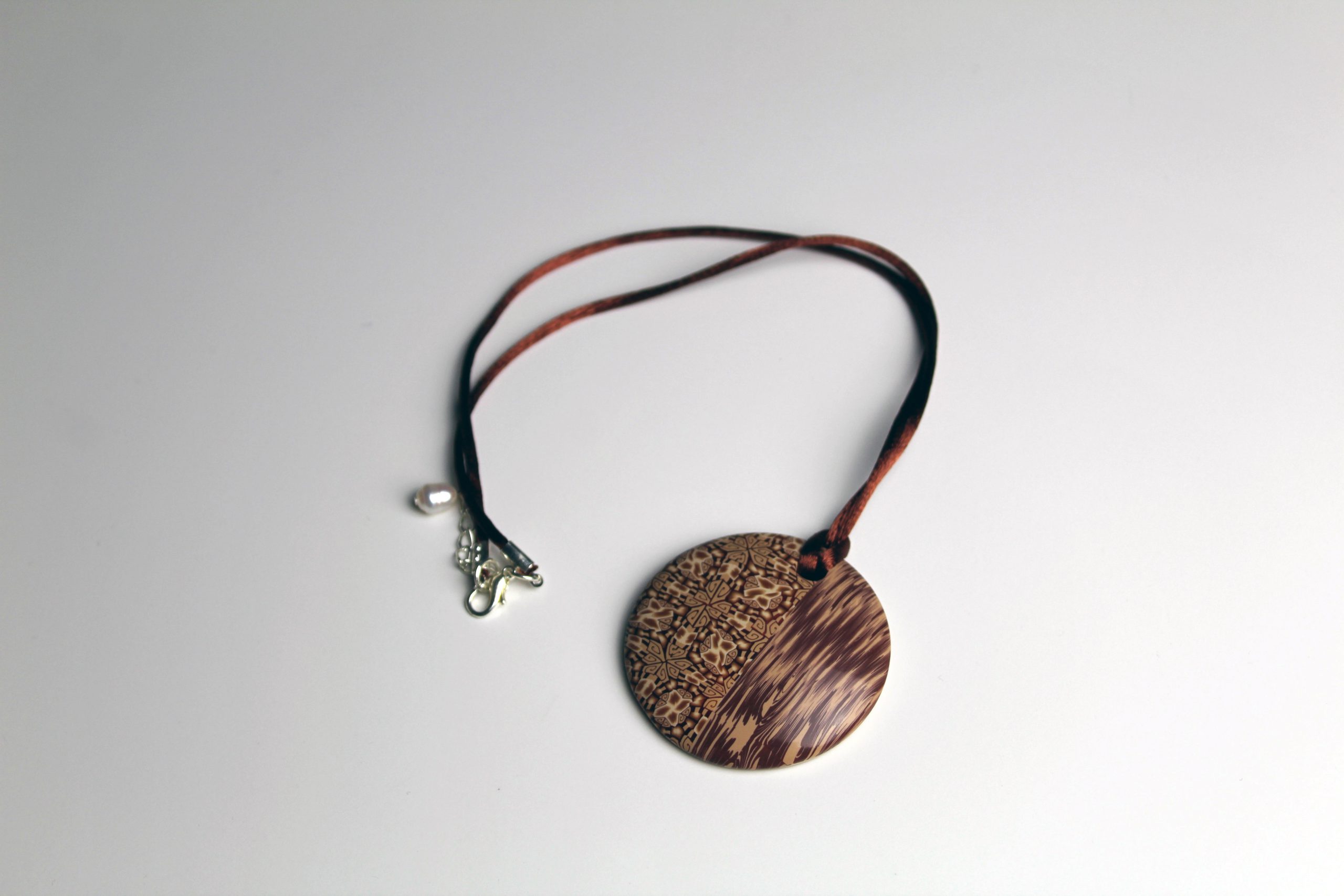 Colgante de 5 cm de diámetro, elaborado con la técnica de la murrina caleidoscópica, que confiere ese aspecto de filigrana a la pieza.