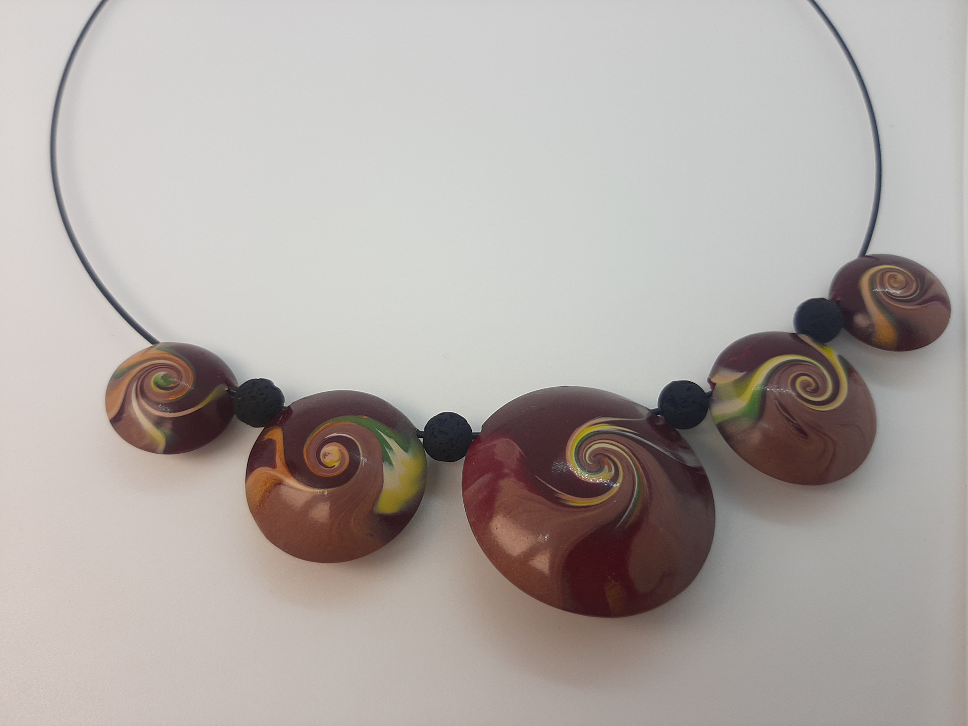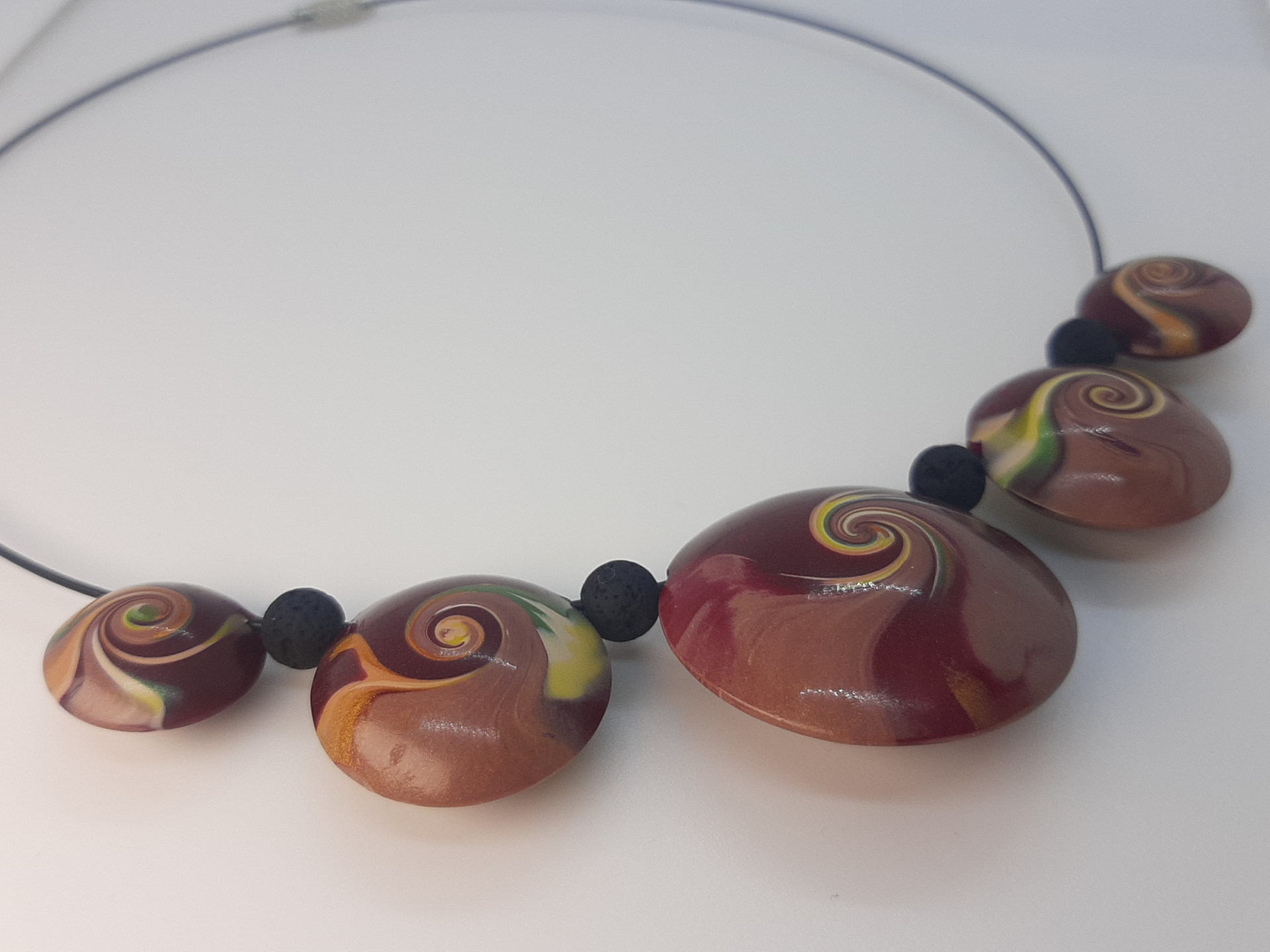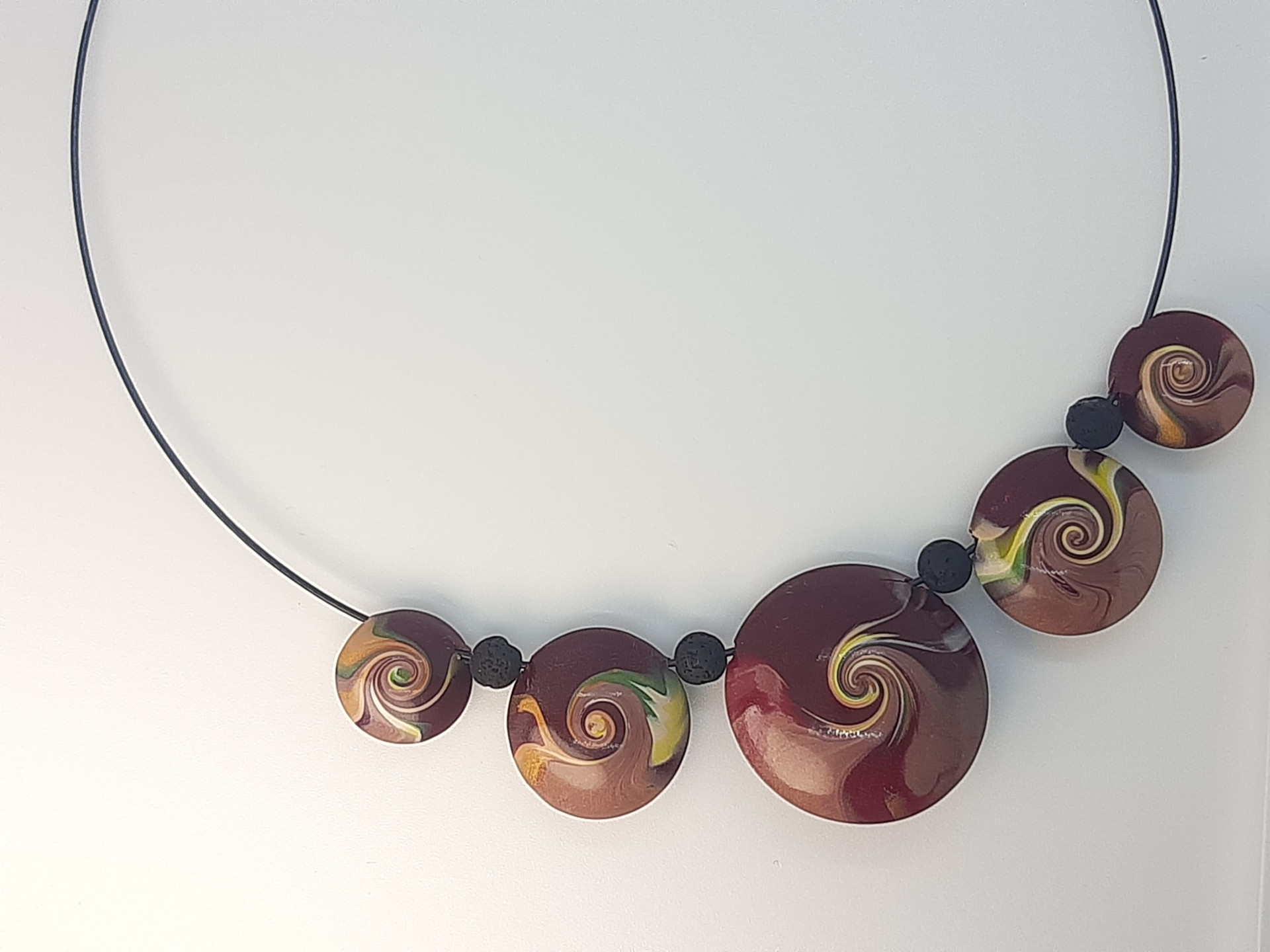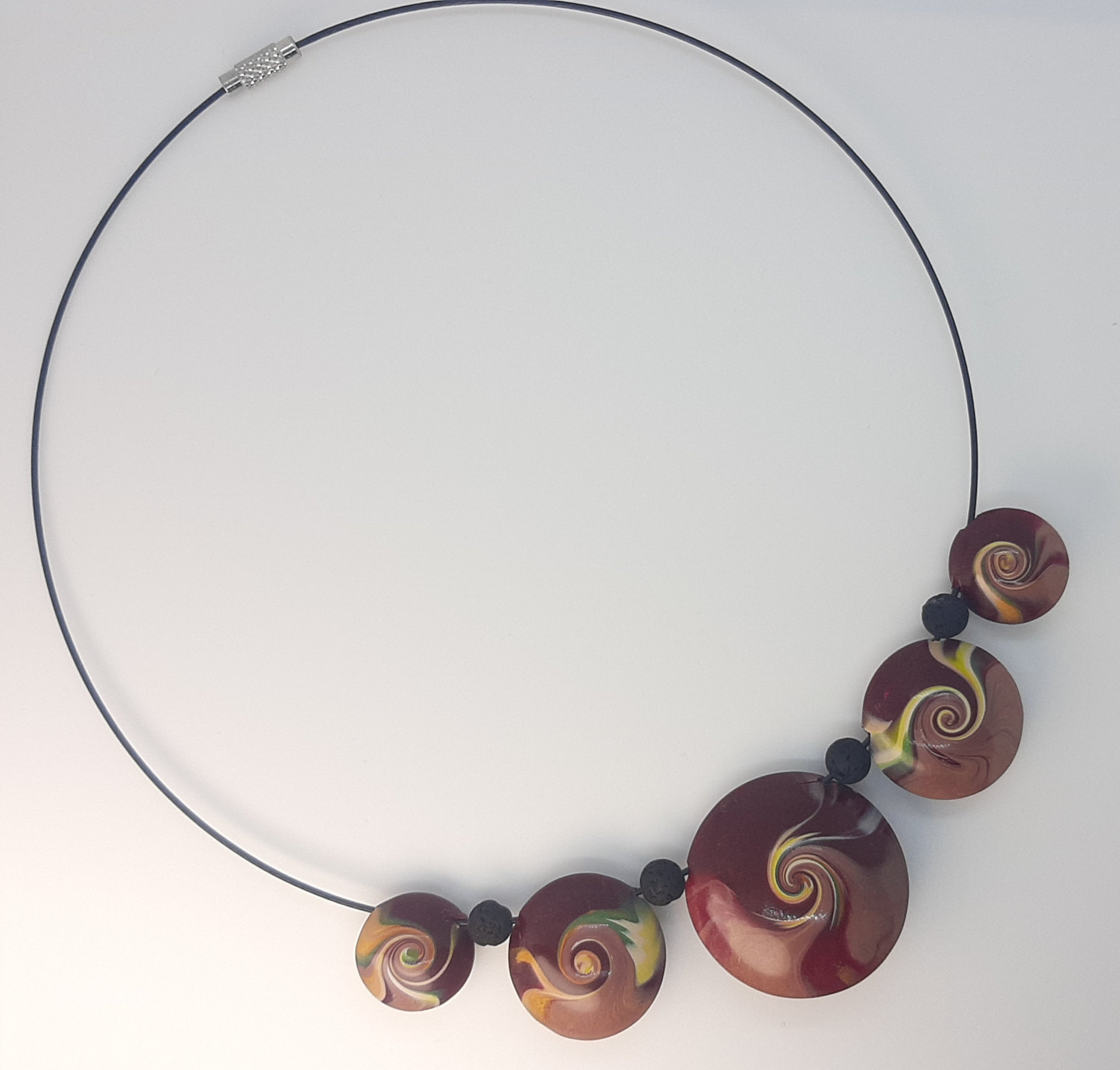 Gargantilla de alambre de 14 cm de diámetro. Las piezas engarzadas van desde los 3,5 cm de diámetro a los 1,5 cm.