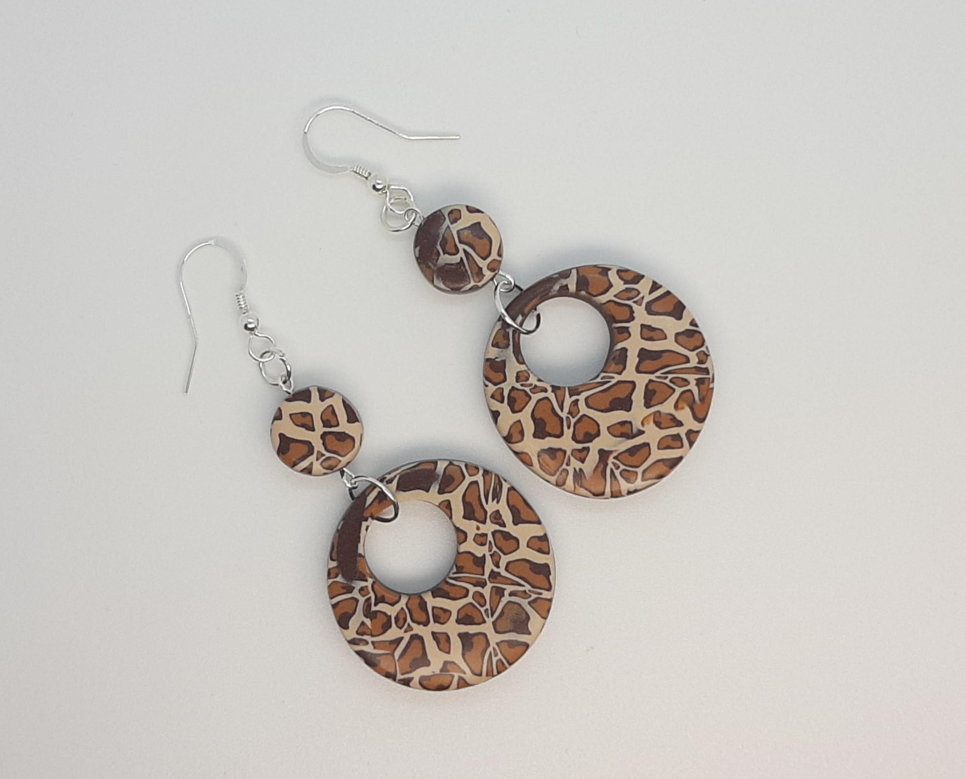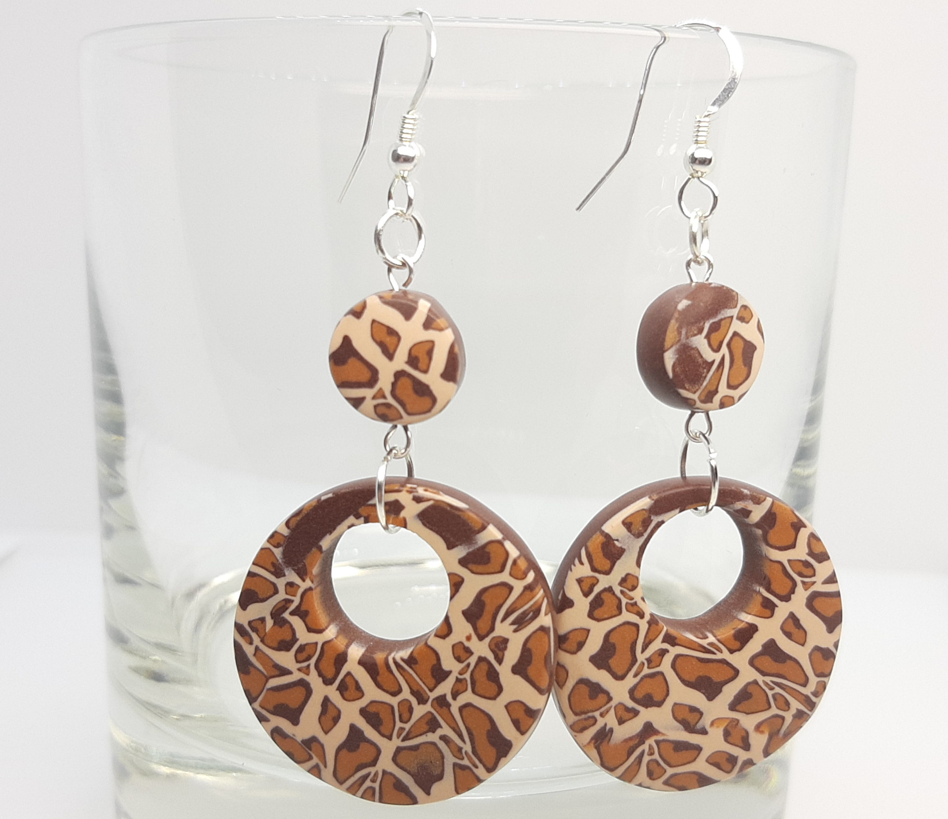 Pendientes de 5 cm de largo, con la pieza principal de 3 cm de diámetro, elaborados con la técnica de la murrina, tratando de imitar la piel de leopardo.