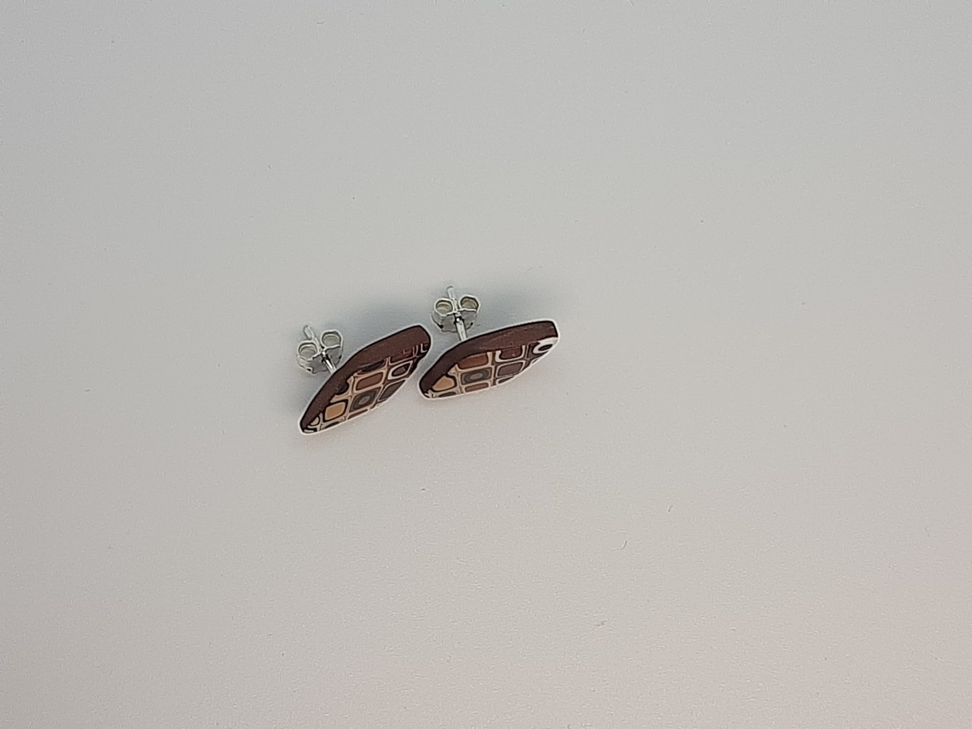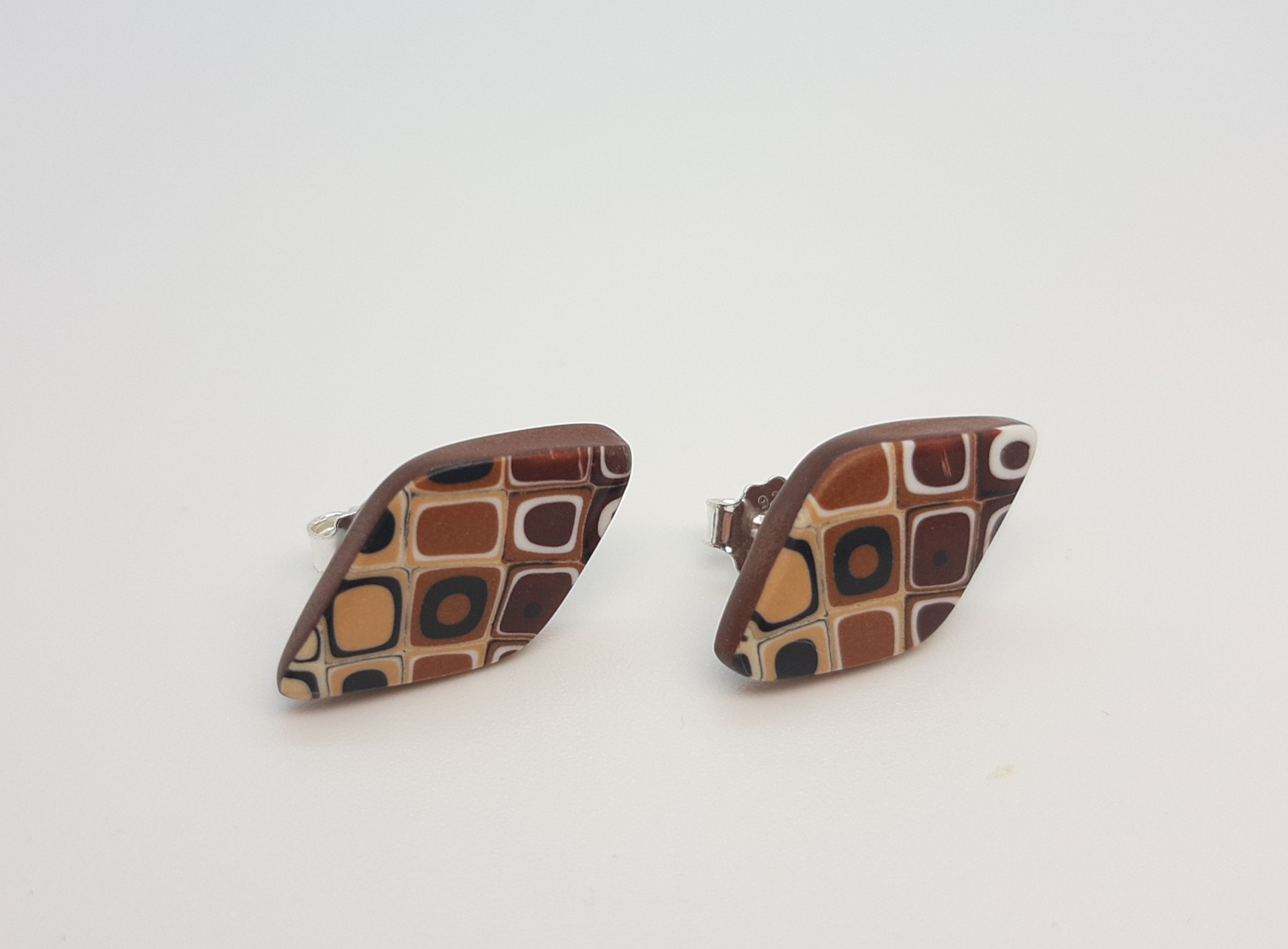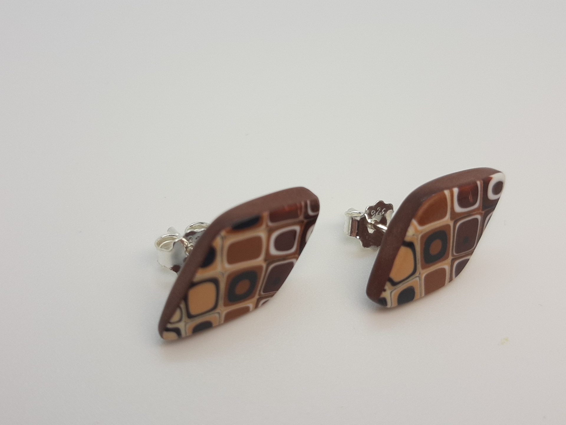 Pendientes de 2 x 1 cm de lado, elaborados con la técnica de murrina realizada con la extrusora en degradado.