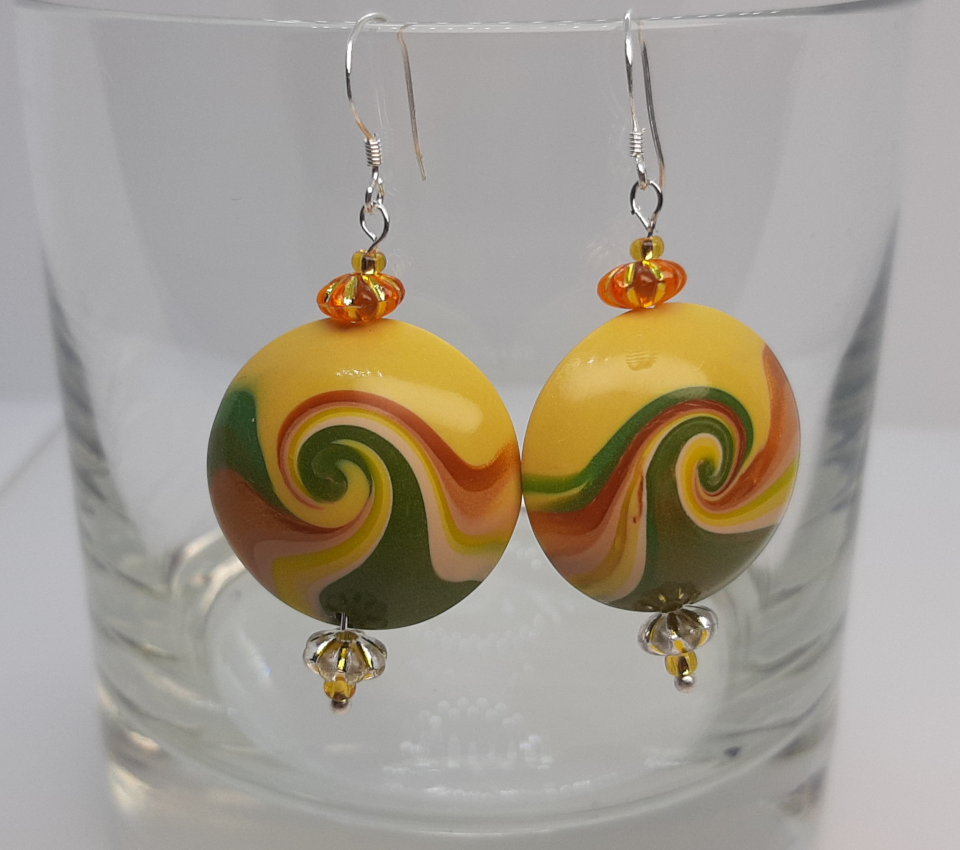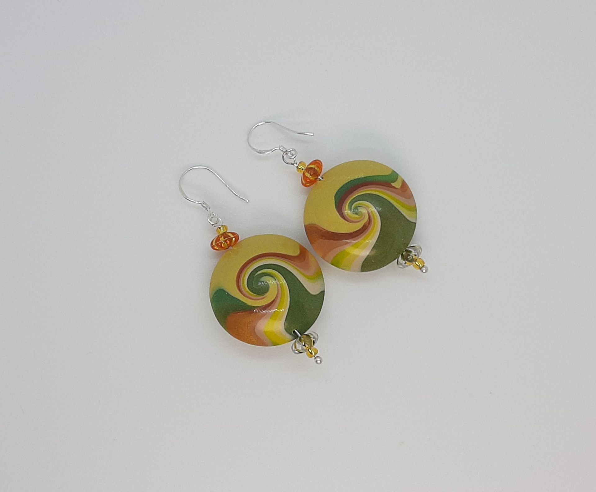 Pendientes de 2,5 cm de diámetro, elaborados con la técnica de cuentas rotadas, que genera las espirales de vértigo en este tipo de piezas.